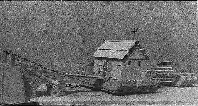 Da alcuni resti recuperati presso i piloni del Ponte Neroniano, presso Castel S.Angelo, (una mola, una catena e alcune tavole del barchino) è stato possibile ricostruirne un modellino in scala. (fig.A3)