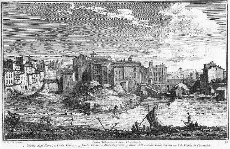 E5 - "Isola Tiberina verso occidente". Sul ramo sinistro, a monte di Ponte Fabricio, è visibile la rampa della mola Sant'Andrea o di Ghetto; su quello destro in primo piano la mole Santa Maria, e seminascoste quelle di SS Annunziata e San Francesco, ancorate all'isola ed altre due ancorate a Trastevere (Giuseppe Vasi 1754)