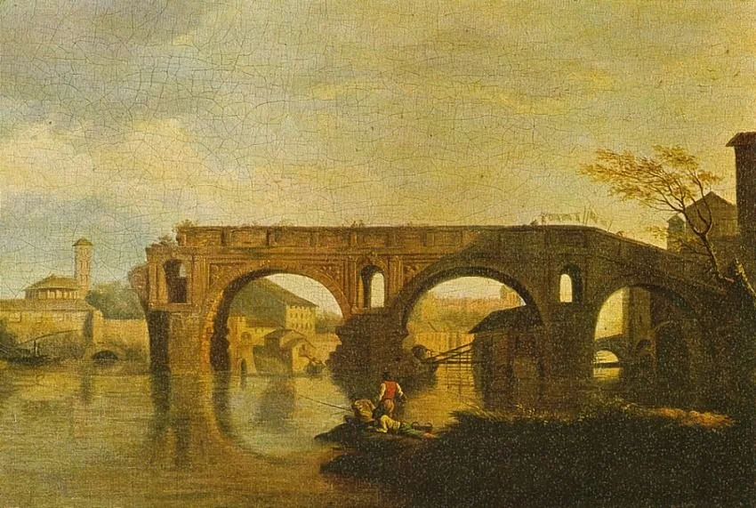 E10 - In questo dipinto di fine '800 a monte di Ponte Cestio, dietro l'arco, si intravede la rampa di quella che fu la Mola di Ghetto (Sant'Andrea)