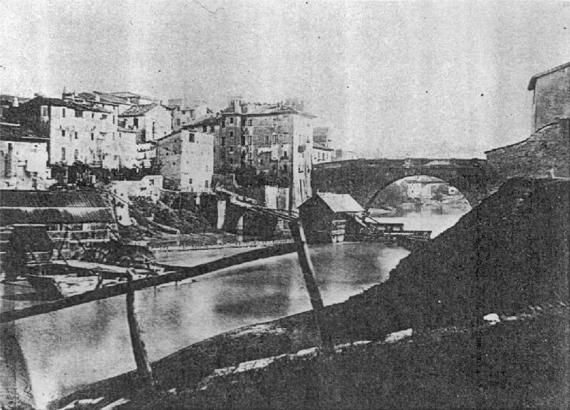 E2 - La foto è presa da Ponte Rotto; l'isola è a destra. A monte di Ponte Cestio la mola San Francesco al centro dell'arco, quella SS Annunziata subito dietro e in fondo una terza mola ostruiscono quasi completamente il ramo destro del fiume (Chaffourier 1870)