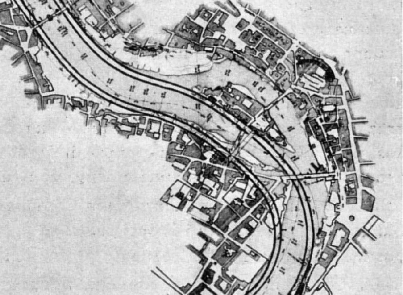 C2 - Il progetto di deviazione del Tevere proposto da Garibaldi: all'interno della città il fiume avrebbe continuato a scorrere in un alveo più stretto e rettificato