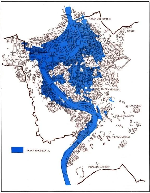 C1 - Planimetria delle zone di Roma inondate dalla piena del 1870 (dis. S.Pascolini; da M.Bencivenga e altri - 1995); l'immagine mostra le zone inondate sia per straripamento del fiume che per rigurgito delle fognature