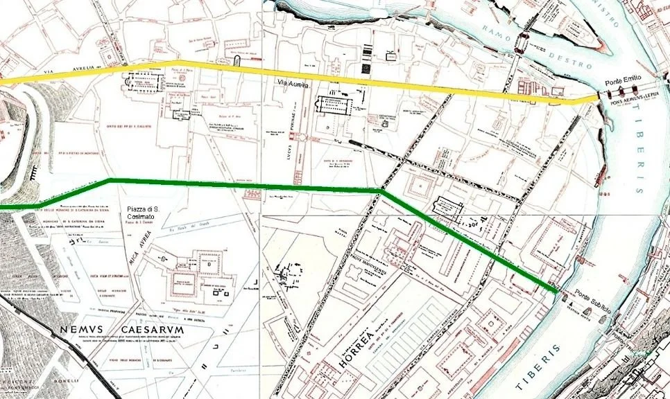 Durante i primi secoli della storia di Roma esisteva una sola linea di comunicazione della città con le località dell'Etruria: la strada che, passando sul ponte Sublicio, tagliava la pianura trasteverina all'altezza di S. Cosimato e saliva ripida sul Gianicolo (in verde nella fig.1); il ponte Sublicio era inoltre l'unico attraversamento stabile del Tevere.