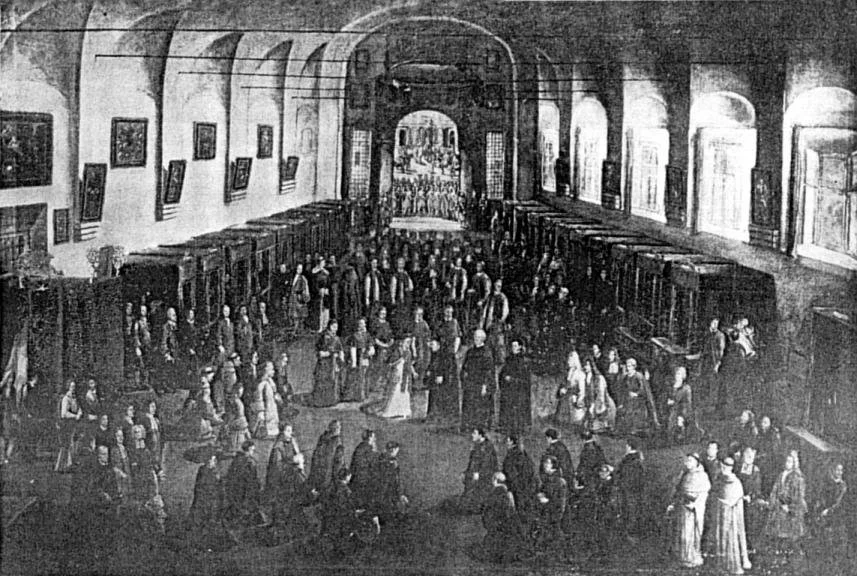 Il dipinto in fig.C5, andato perduto a Milano nel 1943 sotto ai bombardamenti, raffigurerebbe la seconda visita di Clemente XI, effettuata nel 1705 per l'inaugurazione della nuova sala; tuttavia recenti studi [10] hanno evidenziato che in tale data la sala non era ancora realizzata e che pertanto il quadro è da ritenersi dipinto prima del suo completamento, probabilmente come ringraziamento alla generosità del pontefice, ciò confermato dalla evidente diversità dell'arco rappresentato da quello poi effettivamente realizzato.
