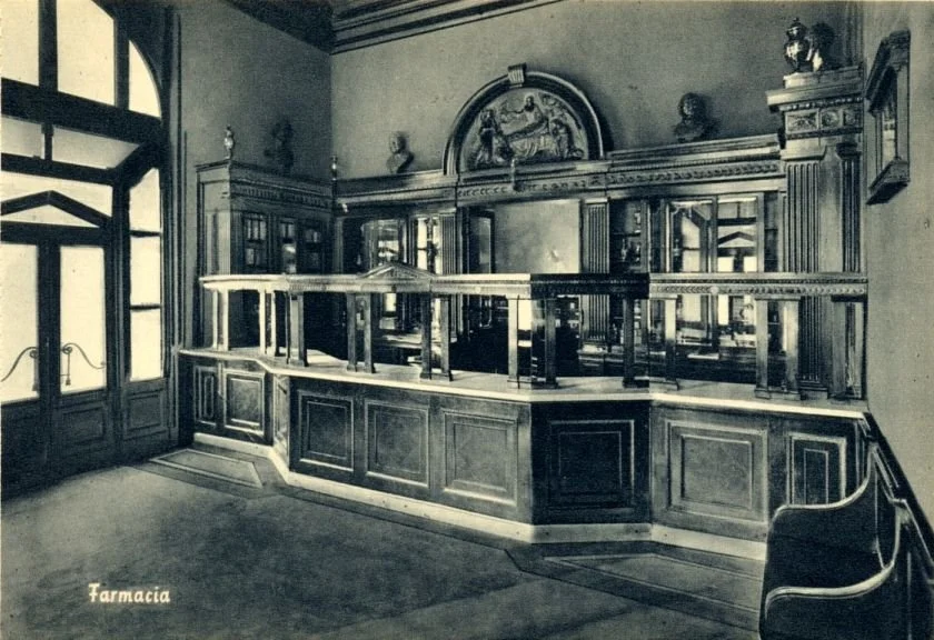 La presenza di una farmacia è da ritenersi contemporanea all'insediamento dei Fatebenefratelli nell'isola in quanto la sua esistenza è documentata già alla fine del 1500. Nella relazione della Visita Apostolica del 1663 si legge: "Contigua al portone del convento, dentro una stanza assai capace e rispondente nella strada pubblica, si esercita da un secolare, che ha ivi la comodità di abitarvi, la spetiaria..." e in quella del 1699 che la "farmacia sta vicino al portone del convento a mano sinistra nell'entrare, dove vi è la porta". La farmacia occupava quindi il locale tra la Sala Assunta e il corridoio di ingresso del convento, accessibile da una porta che si apriva su quest'ultimo; una seconda entrata verso il chiostro fu fatta murare per maggior custodia della clausura. L'accesso al pubblico sul lato strada avveniva probabilmente solo attraverso una grata, come in uso all'epoca. La fig.C6 raffigura l'interno della farmacia come appariva intorno al 1960.