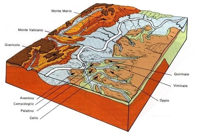 Sul lato destro due profonde incisioni solcavano la dorsale Monte Mario-Gianicolo delimitando il Colle Vaticano; sulla riva sinistra le incisioni erano più numerose iniziando a delineare i "colli" mentre un'altra sfociava nella valle che sarebbe diventata la zona paludosa del Velabro, arrivando al Tevere presso l'attuale isola Tiberina.